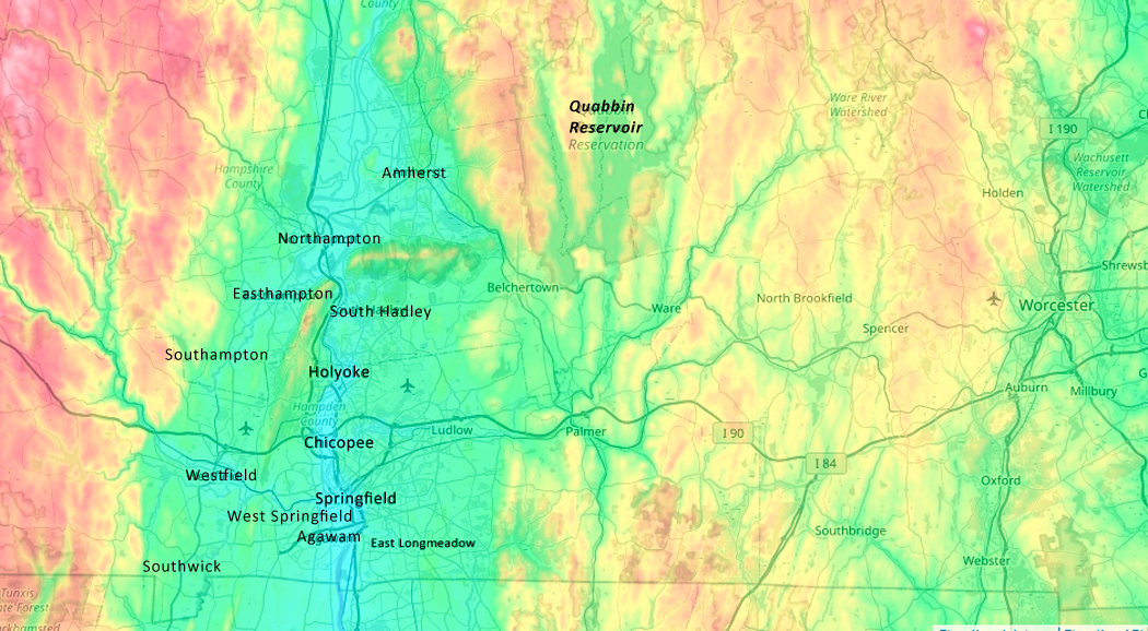 (click above) by low elevations, ranging from 54 to 248 feet above sea level, and surrounded by mountains. The Holyoke Mountain Range average height is 900 feet, the Worcester hills 600 feet and the Berkshires 1200 to 1724 feet. These low-lying areas trap air, contribute to weather inversions, which can worsen air quality. This is one reason the Springfield area ranks among the highest in the nation for asthma and other respiratory conditions. The toxic smoke, poisonous gases and heavy metals from a fire lasting 2 to 5 days would not be confined to the proposed site. Fumes would become concentrated in the valley, but could travel 35 to 50 miles. Portions of UMASS – Amherst are only 54 feet above sea level.